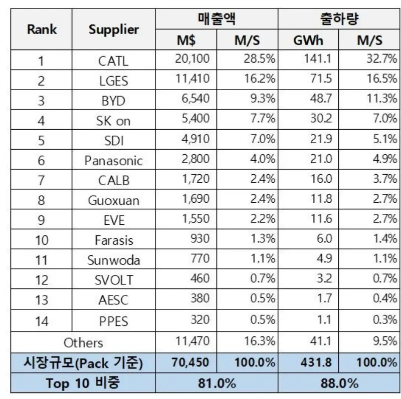 2024年1-6月全球动力电池销量占比 SNE Research
