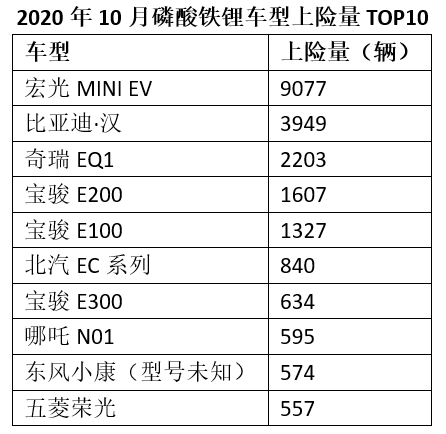 前10款磷酸铁锂配套车型分别为比亚迪·汉、宏光MINI EV、奇瑞EQ1、宝骏E200、宝骏E100、北汽EC系列、宝骏E300、哪吒N01、东风小康C36和五菱荣光。