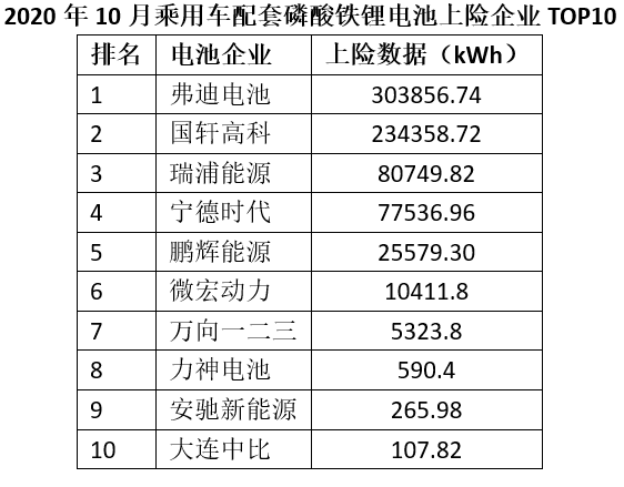 配套电池企业方面,由于比亚迪·汉的热销,10月份弗迪电池也同样拿下了乘用车磷酸铁锂电池配套装机量第一的位置。