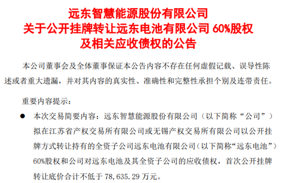 11月25日,远东智慧能源(下称“智慧能源”)发布公告称,公司拟以公开挂牌方式转让持有的全资子公司远东电池60%股权和公司对远东电池及其全资子公司的应收债权,首次公开挂牌转让底价合计不低于7.86亿元。