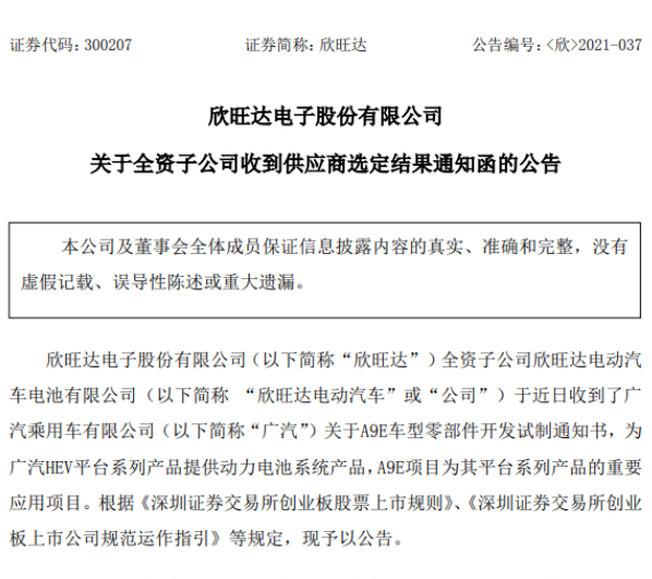 欣旺达表示,广汽是目前国内主要汽车制造公司之一,本次公司被选定为广汽HEV平台系列下A9E项目动力电池零件定点供应商,是公司在动力电池业务方面的重要进展,有利于增强公司在动力电池领域的综合竞争实力。