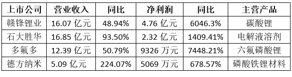 碳酸锂价格的上涨直接推高了磷酸铁锂和六氟磷酸锂等碳酸锂下游材料的成本。受此影响,下游也掀起“涨价潮”。在产品涨价助攻下,相关上市公司业绩也非常亮眼。
