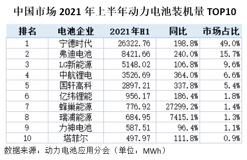 上半年中国市场新能源汽车装机量TOP10的电池企业分别为宁德时代、弗迪电池、LG新能源、中航锂电、国轩高科、亿纬锂能、蜂巢能源、瑞浦能源、力神电池和塔菲尔。